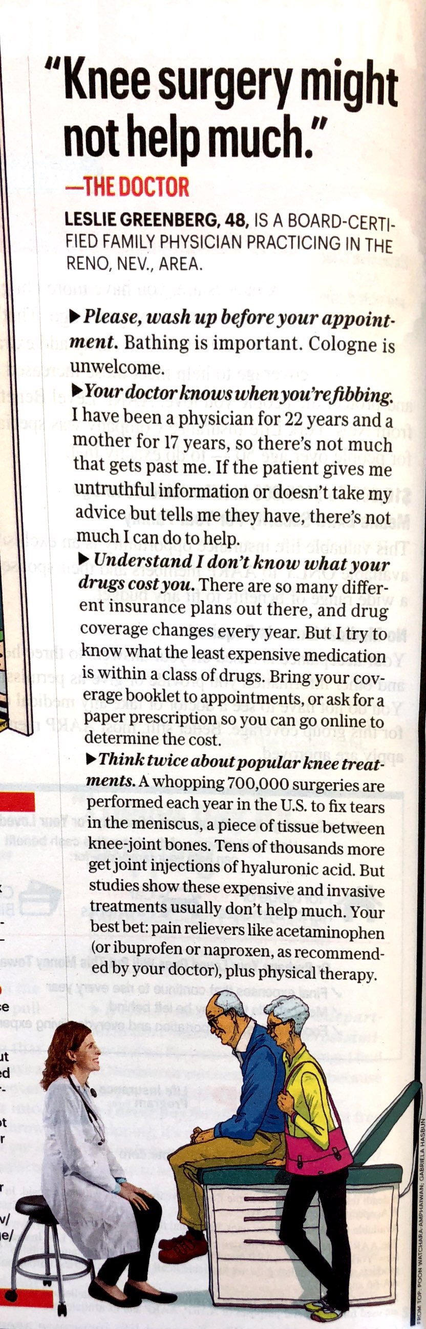 AARP Bulletin met medische tips van ondergetekende! Disclaimer: Praat met uw arts over uw specifieke kniepijn. Als u rondloopt met bot-op-been artritis, heeft u wellicht een totale knievervanging nodig (en GEEN kandidaat zijn voor conservatief management). En als uw kniepijn niet binnen 2 maanden beter wordt of als u een voorgeschiedenis van nierproblemen heeft, overleg dan met uw arts over de juiste behandeling.